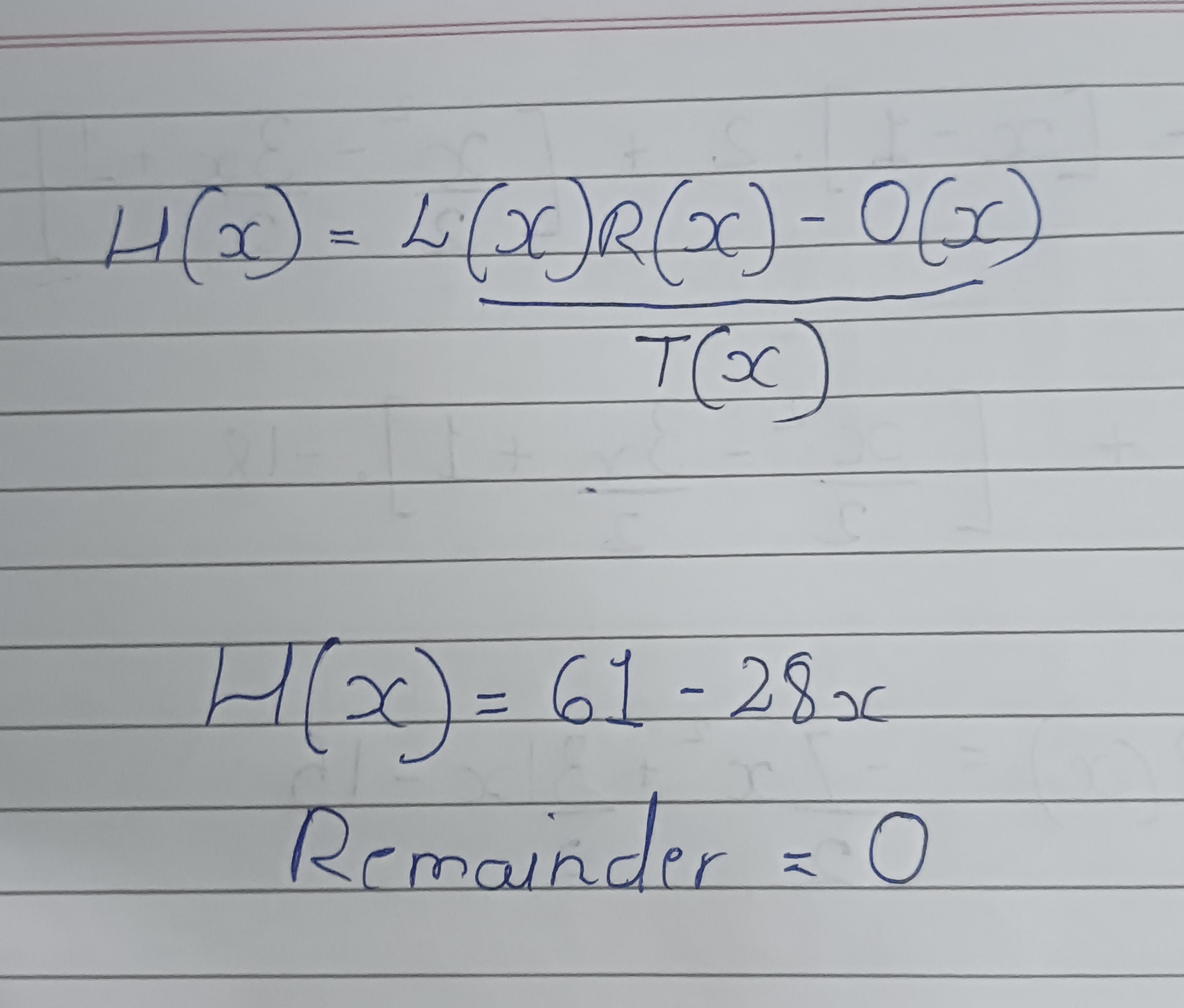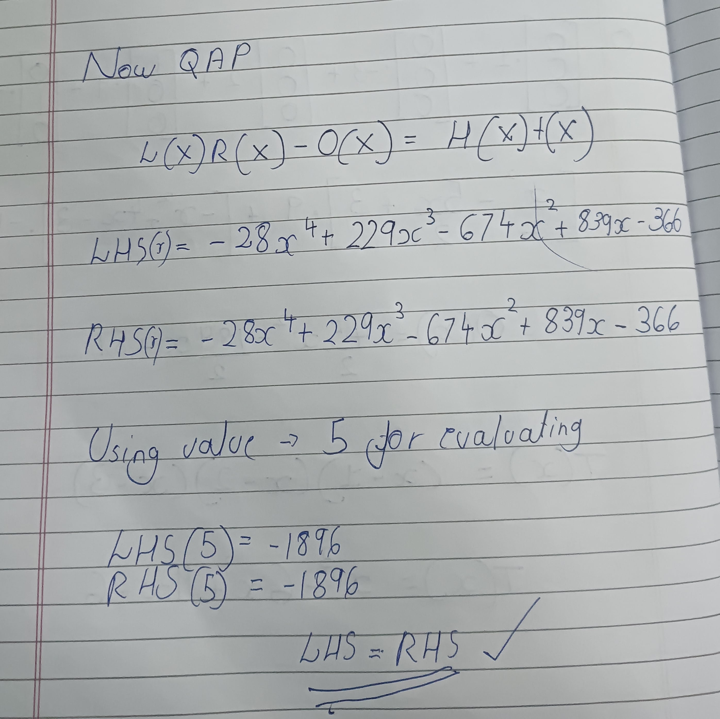 If we get the LHS and RHS equal, then yeah, we’ve successfully verified it. One more thing is that we can see if we’ve made any mistakes along the way if the remainder when dividing the numerator with t(x) when computing h(x) is zero or non-zero. If we get a zero remainder, we are indeed correct!