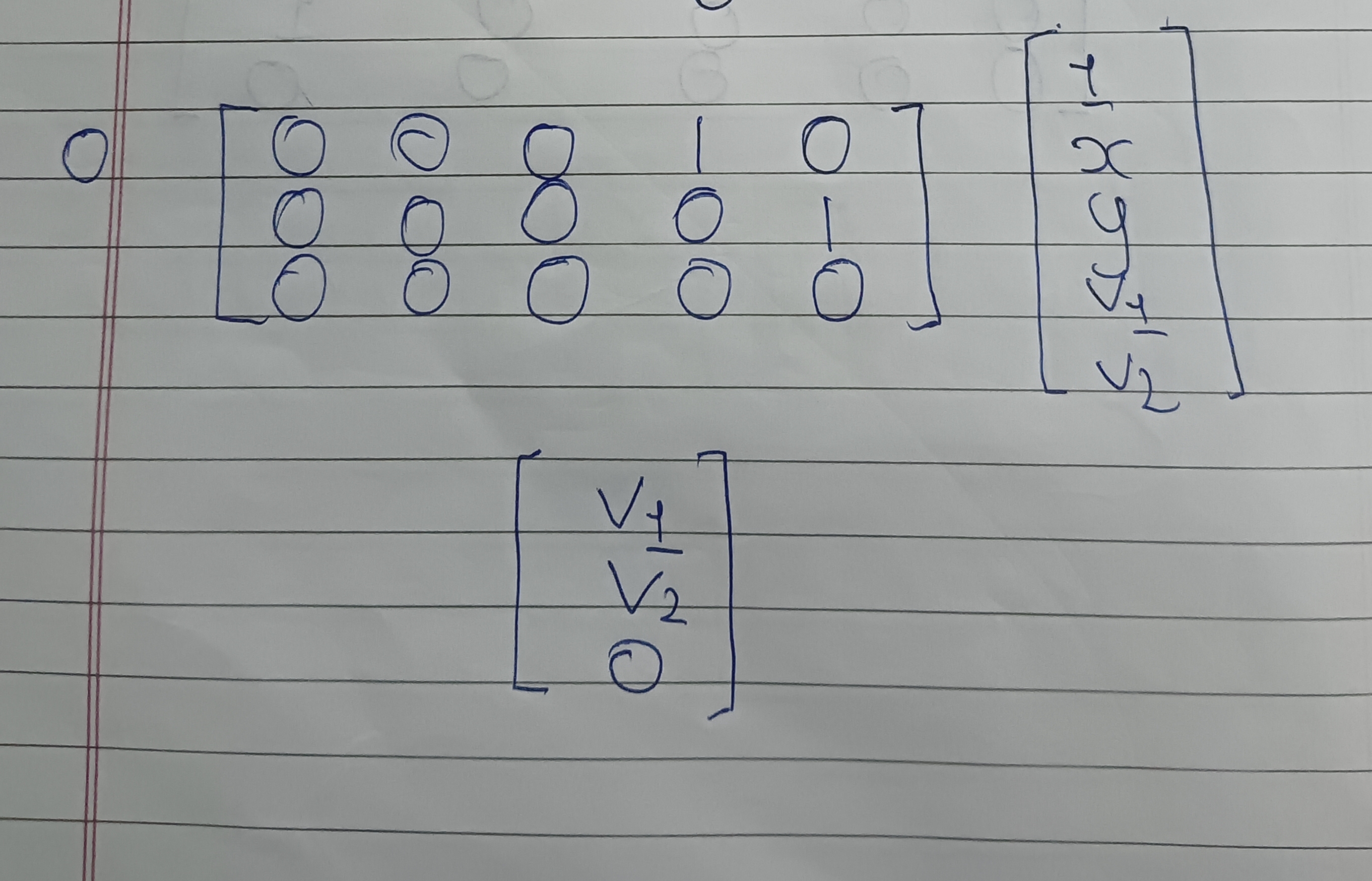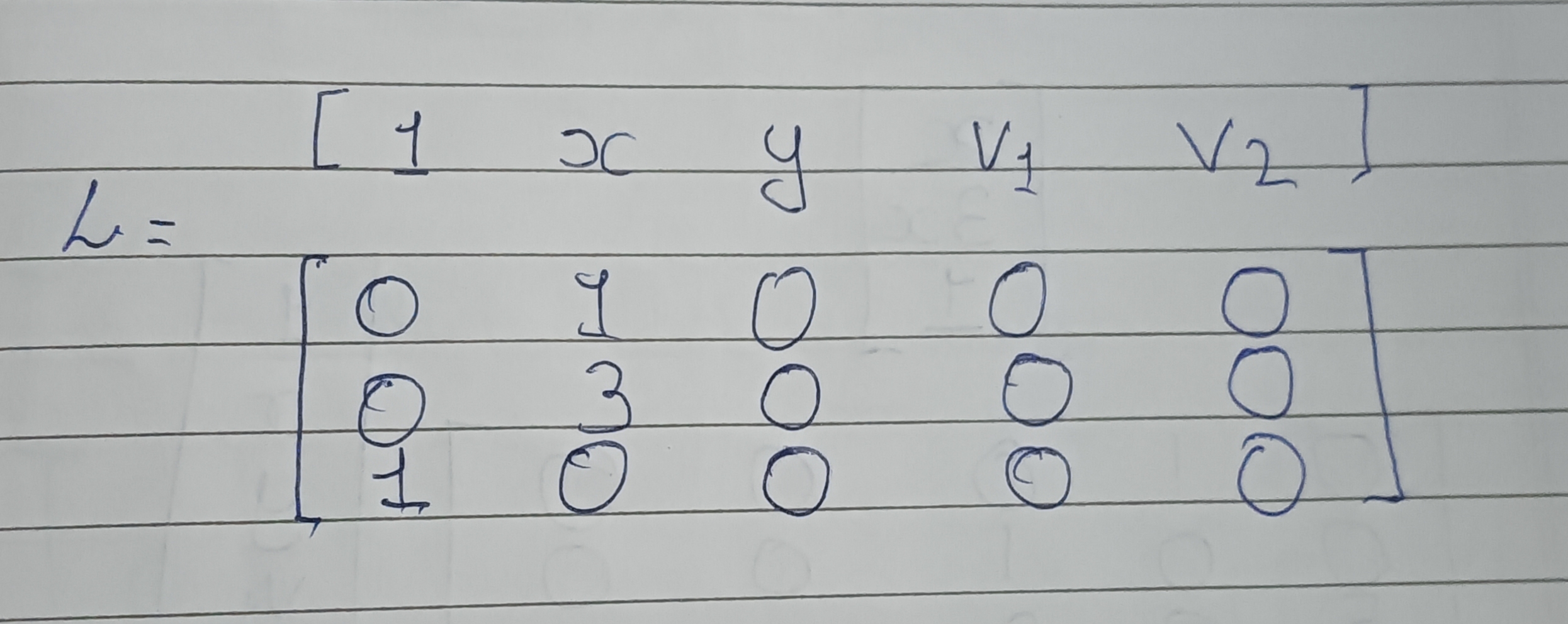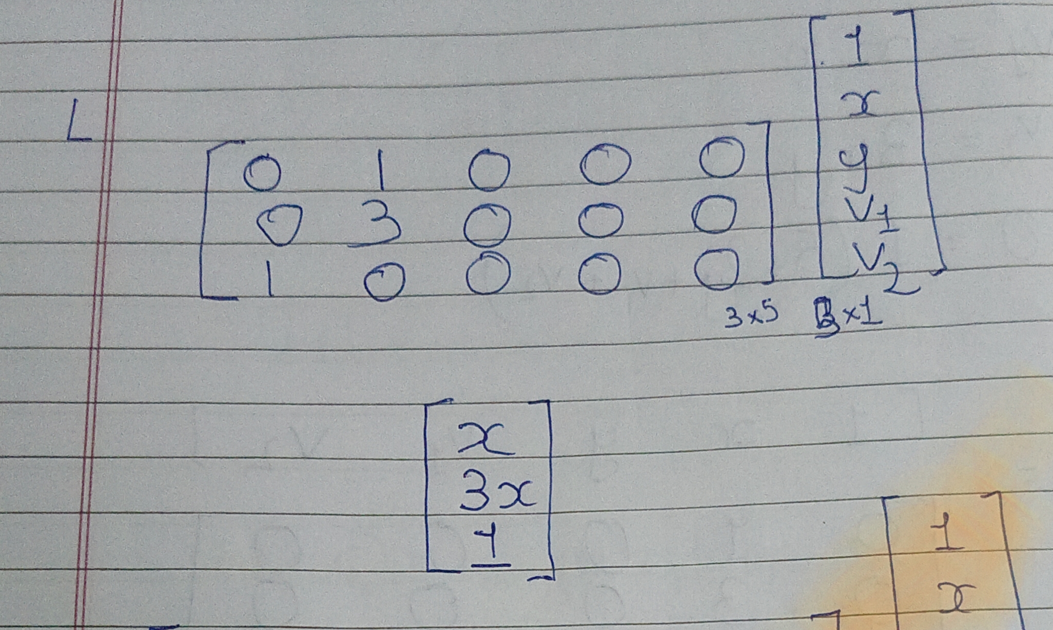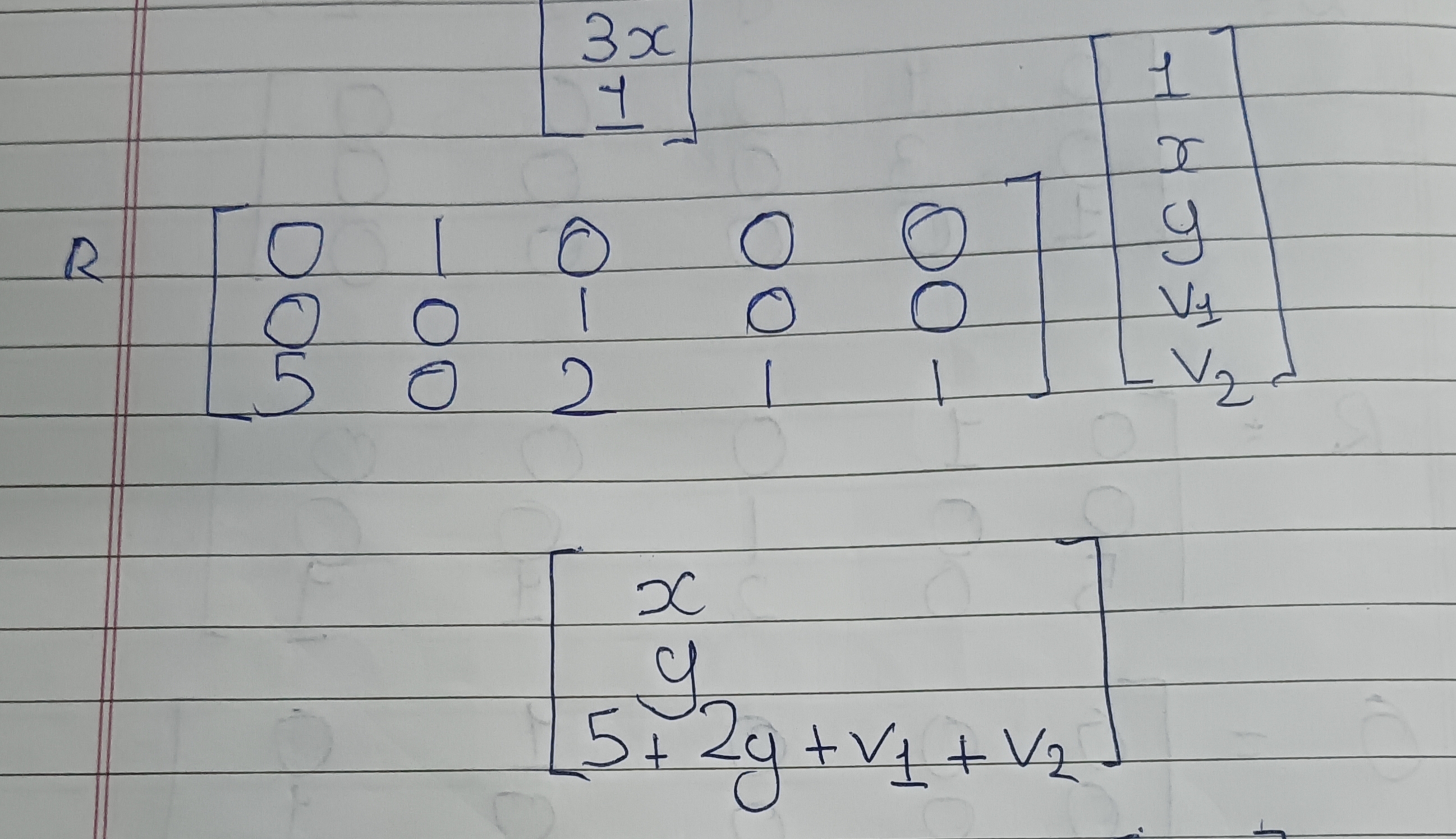 \[\begin{aligned} v_1 &= x \cdot x \\ v_2 &= 3xy \\ 0 &= 1.(5 + 2y + v_1 + v_2) \end{aligned}\]Now our witness vector is going to be of the form: [1, x, y, v1, v2]